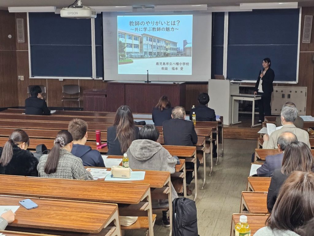 全体会の開会行事では、昨年度の引き続き、現役教師による「基調提言」を実施しました。鹿児島市立八幡小学校の福本 愛教諭が、「私が思う教師のやりがい」として、①子どもと一緒に成長できる仕事、②「ありがとう」と感謝される仕事 ③得意や専門性を生かせる仕事について、自らの実践をもとに、熱い思いを語ってくれました。学生さんはもちろん、教職OBなどにも大きなインパクトを与えました。
